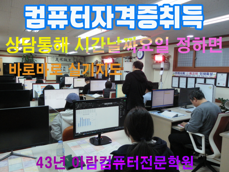 안녕하세요.컴퓨터자격증다따네! 아람컴 아람돌이입니다. 고3 수시 발표 및 예비고 특성화고 합격자가 줄줄이 발표 나면서 최근 상담문의가 많아졌는데요~~ 최근에 아람 컴퓨터학원에 문의 오는 자격증 중에 가장 1순위는 컴활 1급 실기 자격증입니다. 필기 반도 원할 경우 특강반으로 개강해서 수업을 나가는데 최근에는 필기는 개인적으로 공부하시고 1급 실기하기 위해 오시는 분들이 많습니다. 특히 실기를 3~5번까지 시험 보시고 오시는 분들도 많으세요. 빔프로젝터 수업을 잘 따라가지 못하거나, 인강을 돌리고 돌려서 봐도 잘 이해가 안 된다고 하시면서 오시는 분들도 있으세요. 다 장단점은 있지만 옆에서 바로바로 알려 드리고 자기 수....... <img src="https://blogthumb.pstatic.net/MjAyNTEyMTFfMTgx/MDAxNzY1NDM0Nzc5NTg4.yJiI-UhkJYJXlVMHI8vxj0xucR12pWrqzTd1SRTngwEg.gypa8DbITdjD3kE3T6mxhLnMcNQFb1bxVKyMKEOGDj4g.PNG/%C4%C4%C7%BB%C5%CD%C0%DA%B0%DD%C1%F5%C3%EB%B5%E627.png?type=s3" />