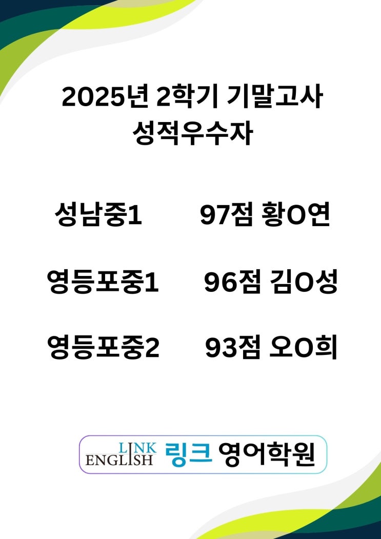 25년 2학기 1~2학년 기말고사 영어 성적 우수학생 [링크영어학원]