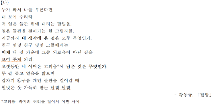 2027 수능특강_황동규, <달밤> <2027 수능특강 문학> ■ 황동규, <달밤> 해제 이 작품은 친구들과 대화를 나누는 광경을 상상하며 정체성의 변화를 모색하고 있음을 형상화한 시이다. 시적 화자는 자문자답의 형식으로 자신이 처한 현실에 대한 인식과 태도, 자신이 품고 있는 앞으로의 삶에 대한 의지를 드러낸다. '달빛', '구름 개인 들판' 등의 시각적 이미지를 통해 어둡던 과거를 청산하고자 하는 의지를 형상화하고 있다. ■ 황동규, <달밤> 핵심 정리 ★날다국어 2관★ 중/고등 내신국어/수능국어 학교별/교과서별 대비 국어 문법/ 영문법 핵심개념/심화/실전 내신국어/수능국어/내신영어/수....... <img src="https://blogthumb.pstatic.net/MjAyNjAzMTdfOTcg/MDAxNzczNzM0Mjg4NjQy.jkeaUK04cWqABevJZpOx4Pf1i-cPqjwe93LITDzHUMog.x6W5PPiYd5n3mfySou_WniasnwY3jClAkuwg68v_O0Ug.PNG/image.png?type=s3" />