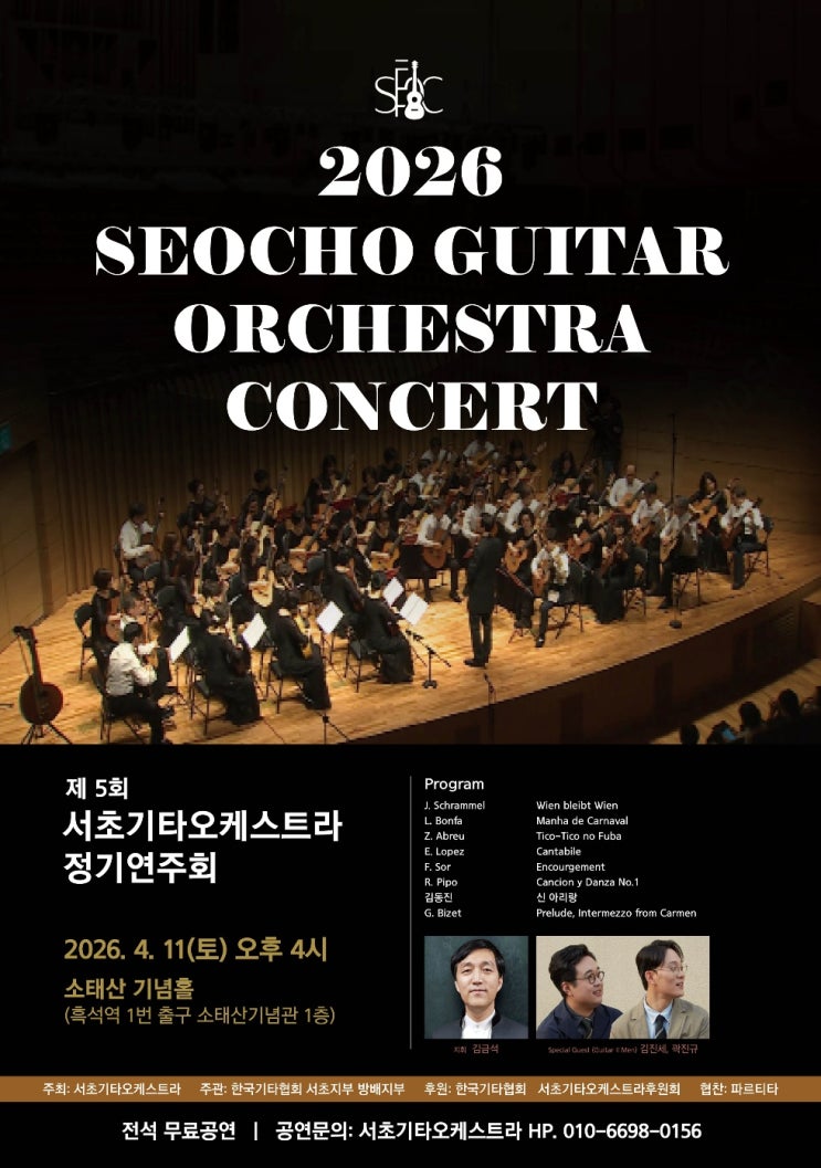 제5회 서초기타오케스트라 정기연주회 일시: 2026년 4월 11일 토 오후 4시 장소: 소태산기념홀 (9호선 흑석역 1번출구 소태산기념관빌딩 1층) 주최: 서초기타오케스트라 주관: 한국기타협회 서초지부 방배지부 후원: 한국기타협회, 서초기타오케스트라후원회 협찬: 파르티타 전석 무료공연 ※특별출연: Guitar II Men 김진세 곽진규 <img src="https://blogthumb.pstatic.net/MjAyNjAzMjNfODQg/MDAxNzc0MjY2MjgxMTky.YeMnwS4pIoSgNJnqkAJzxcOlqtmt4eNKGhpvTOiDWbYg.SxecBzgnpiNf5HztDTK2aepv9CgQEx7QRNcnaHSSmyEg.JPEG/%C6%F7%BD%BA%C5%CD.jpg?type=s3" />