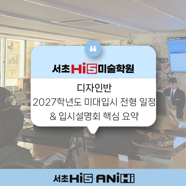 안녕하세요 서초 하이파이브 미술학원 디자인반입니다. 최근 진행된 디자인 미대입시설명회에 많은 학부모님들께서 참석해 주셨는데요, 바쁘신 일정 속에서도 시간을 내어 방문해 주셔서 진심으로 감사드립니다. 설명회를 진행하면서 느낀 점은, 단순히 “입시 정보”를 넘어서 아이들의 방향성과 준비 과정 에 대해 진지하게 고민하고 계신 분들이 많다는 것이었습니다. 오늘은 바쁜 일정으로 참석하지 못하셨거나, 복잡한 입시 용어 사이에서 갈등하고 계신 분들을 위해 설명회 핵심 내용을 쉽고 간단하게 정리해 드리고자 합니다. 2027학년도 미대입시 전형 일정은 아래와 같습니다. 작년도에 비해 크게 변화한 부분이 없으며, 모든 실기....... <img src="https://blogthumb.pstatic.net/MjAyNjAzMjRfMiAg/MDAxNzc0MzM2NzcxMjI0.7dNM0jymJWiyQkewdsU1l9-i8RF48wTZSHCWkDmixz8g.NIk_FI7CIL3kuIqhK5SFo_CiEGmNb4ZCvz32lsqeNF0g.PNG/2025%B3%E2_12%BF%F9_%BA%ED%B7%CE%B1%D7_%C7%A5%C1%F6_%C7%CF%C0%CC%C6%C4%C0%CC%BA%EA_%BD%C3%BE%C8.png?type=s3" />