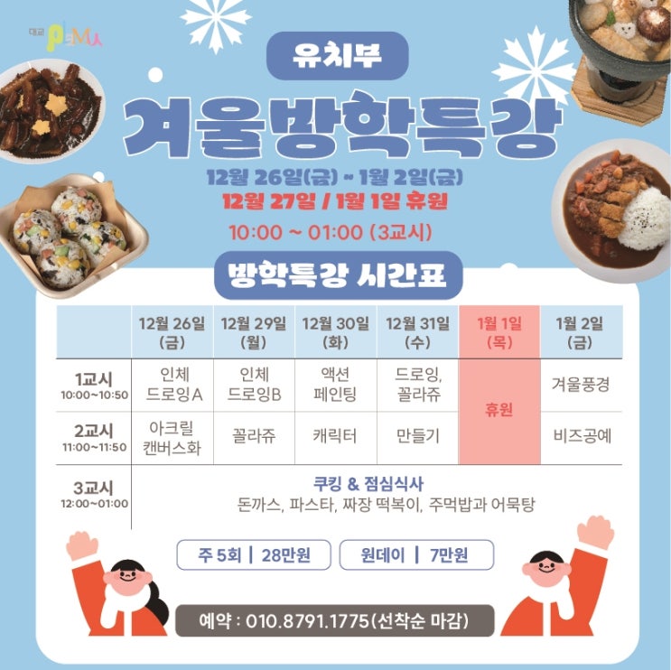 유치부 방학특강 일정과 초등부 방학특강 일정 안내드립니다. 유치부 방학 특강수업을 10시부터 1시까지 3시간 수업으로 진행합니다. 알차고 특별한 겨울방학 미술캠프입니다 아트활동은 인형 옷 꾸미기 인체드로잉 (사람그리기) 꼴라쥬 기초수채화 액션페인팅캔버스화 비즈공예 쿠킹&점심식단은 김밥.돈까스.짜장떡복이 주먹밥과 어묵탕.파스타 입니다. 미술 수업을 즐기면서도 드로잉 형태력 스킬수업으로 자신있게 그릴수 있도록 수업해요. 점심도 맛있게 든든하게 먹을수 있도록 식단을 준비했어요 유치부 예약은 마감일이 12/12일입니다~ 예약문의 : 010 8791 1775 초등부 방학특강 3시간 수업은 2주동안 진행하고 이후의 방특은 미술 수....... <img src="https://blogthumb.pstatic.net/MjAyNTEyMDFfNDgg/MDAxNzY0NTU4Nzg3NjEw.OGjHDgQYyGek3uuXMQoeRxyncMZrvTL_X__Y3YY7tEcg.MB1rjudgu5_rxGkuqFn80ATyn8K1S6v4q99iIfxzdPkg.JPEG/1764125415123.jpg?type=s3" />