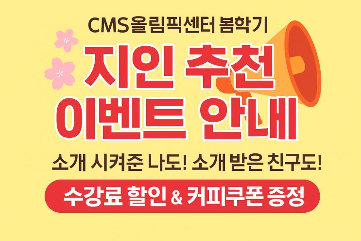 CMS올림픽센터 봄학기 지인 추천 이벤트 안내 추천한 재원생도! 추천받은 친구도! 함께 혜택을 받는 특별한 봄 이벤트 CMS올림픽센터에서 봄학기 개강에 맞춰 재원생 여러분의 높은 만족도를 기반으로 한 지인 추천 이벤트를 진행합니다. 입학시험 응시만 해도 MEGA 커피 쿠폰이 제공되며, 등록 시 추가 할인 혜택까지! 이번 기회를 놓치지 마세요 이벤트 대상 ✔ 추천인 3/2(월) 기준, 사고력 수업에 배치된 재원생 ✔ 피추천인 추천을 통해 봄학기 입학시험에 응시하고 등록한 학생 ️ 이벤트 기간 안내 지인 추천 접수 3/3(화) ~ 3/11(수) 입학시험 응시 3/3(화) ~ 3/14(토) → QR코드 제출된 학생은 해당....... <img src="https://blogthumb.pstatic.net/MjAyNjAzMDNfMTQ4/MDAxNzcyNTI5ODk3MjUz.EF4fh7VvBTdVXWeiNVp6aHPc4e2W7mm6yUkNfCgF4y0g.HvQFwnMkczs2aRDtBH1UwB7xzOsaKarcIX_6R-LDVY4g.PNG/Designer_%288%29.png?type=s3" />
