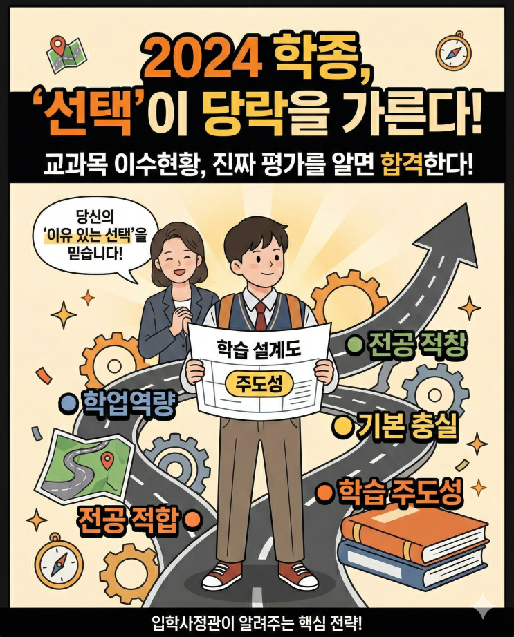 2024 학종, 성적이 전부가 아닙니다! 입학사정관이 진짜 보는 것은 단순 성적표가 아닌, 여러분의 학습 설계와 '이유 있는 선택'입니다. 학업역량, 전공적합성, 그리고 가장 중요한 학습 주도성까지! 성취 결과보다 더 중요한 성취 과정을 보여주는 '교과목 이수현황'의 진짜 평가 기준을 입학사정관이 알려주는 핵심 전략으로 정리했습니다. 지금 바로 이 한 장의 웹툰으로 합격의 길을 열어보세요! 학생부종합전형에서 교과목 이수현황은 오래전부터 평가 요소였음 그러나 2024학년도 이후 자기소개서 폐지, 비교과 축소라는 구조적 변화 속에서 교과목 이수현황은 단순한 참고자료를 넘어 학업역량과 전공적합성을 동시에....... <img src="https://blogthumb.pstatic.net/MjAyNjAyMjdfMjEz/MDAxNzcyMTk3MTM1MDAy.06beofyiIjmTUX-MNAOnb96-JIHMa6Vji0FHsmKedDIg.IJqB0hLqe5Bz9MUwMkdchTH_gOJyU8giigVjhoba0Rkg.PNG/Gemini_Generated_Image_dut7oqdut7oqdut7.png?type=s3" />