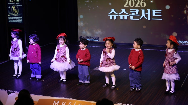 송도5세학원 병아리반, 제 3회슈슈콘서트 무대이야기 4세, 5세 우리 병아리반 친구들이 또 하나의 무대를 완성 했습니다 . 송도 5세학원을 찾는 많은 부모님들이 가장 궁금해 하는 것이 이것 같아요! 우리 아이가 과연 무대에 설 수 있을까요? 결론부터 말씀 드리면, 네! 서요! 그리고 생각보다 훨씬 당당합니다. 무대 분장부터 시작되는 설렘 공연날, 작은 얼굴에 무대 분장을 받으며 거울을 빤히 바라보던 아이들. 처음엔 어색해 하던 표정이 점점 반짝이는 눈빛으로 바뀌는 순간이 있어요. 송도플레이스타뮤지컬학원은 단순히 뮤지컬을 배우는 곳이 아니라 이런 '변화의 순간' 을 경험하게 하는 공간입니다. 코코 OST <기억해줘....... <img src="https://blogthumb.pstatic.net/MjAyNjAyMjBfMjYy/MDAxNzcxNTgxNTc3MTE0.viKKOzYGNQoPyh2JKAkfTEUfv_0sFjVN0myqanLJjrcg.e0_CpFYGXSNJKZ3zDSygs0PPpWRjWx_snmInUToix_Ug.JPEG/SE-a951418e-61cd-4f47-a94d-c5c08eee1e07.jpg?type=s3" />