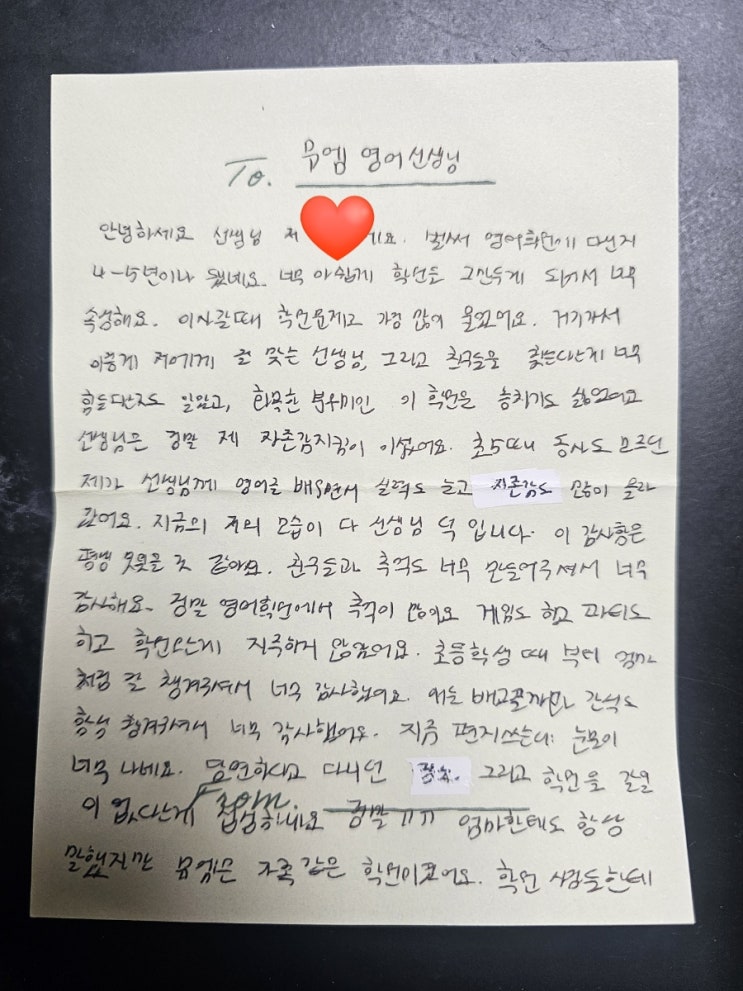 “원장님, 저 이사 가요. 그런데 영어는 여기서 배운 게 제일 좋았어요.” 얼마 전, 한 친구가 이사를 가게 되었다는 소식을 전해왔어요. 학원을 옮기는 이유가 성적도, 친구 문제도 아닌 이사라서 더 아쉽고 더 마음이 먹먹했지요. 그 친구는 초등 때부터 함께한 아이였어요. 처음 왔을 때는 영어가 너무 어렵고 자신감이 없던 아이였는데 중학교에 올라가서는 영어 지문을 또박또박 읽고, 문법 설명도 친구들 앞에서 자신 있게 해내던 아이였어요. 마지막 수업 날, 수업이 끝나고 작은 편지 봉투를 건네주더라고요. “원장님, 영어가 제일 재미있었어요. 여기서 배운 게 제 자신감을 만들어준 것 같아요. 이사 가도 영어는 계속 열심히 할게요....... <img src="https://blogthumb.pstatic.net/MjAyNjAzMDFfMjM1/MDAxNzcyMzc0OTA3NDAw.TQTuJInhvaWOAjGsXQTu1EN8iLhwUSadsPiLcp268qIg.Dbl3blam6LQvmZIPTKifEWrewc6RMSqTgHEKkJG7bvwg.JPEG/900%A3%DF1772374906304.jpg?type=s3" />