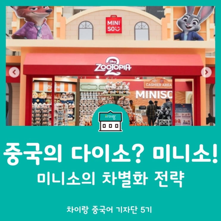 안녕하세요, 차이랑 기자단 5기 김유나입니다. 여러분은 중국 여행 계획에 ‘미니소 쇼핑’ 일정을 넣으셨나요? :) 언뜻 이름만 들어서는 ‘다이소’와 비슷하게 들리는 미니소는, 사실 다이소와는 다른 특성을 가지고 있는 중국의 유통/판매 회사입니다. 오늘은 중국의 미니소에 대해 알아보도록 하겠습니다. 일반 잡화점에서 캐릭터 상품의 성지가 되기까지 미니소는 중국 광저우에 본사를 두고 있는 회사로, 2013년에 설립되었습니다. 미니소는 처음에는 우리가 흔히 아는 다이소나 무인양품과 같이 생활 용품이나 잡화들을 주로 판매하는 회사였습니다. 하지만 2020년부터 미니소의 사업 방향이 크게 바뀌게 되었습니다. 바로 캐릭터 상품을....... <img src="https://blogthumb.pstatic.net/MjAyNjAzMDNfMTMg/MDAxNzcyNTE0MTQ5NTYw.rp9139dH7xC2xuQo9AXm0B0GbezEdPTybxcLOa4aupIg.2IPy6IU7iR1Hlw1QIDOF24ioDYg29ER8RGBFw_L-Em8g.JPEG/%EA%B9%3F%3F%9C%A0%3F%82%98_1%3F%9B%94_02_%3F%8D%B8%3F%84%A4%3F%9D%BC.jpg?type=s3" />