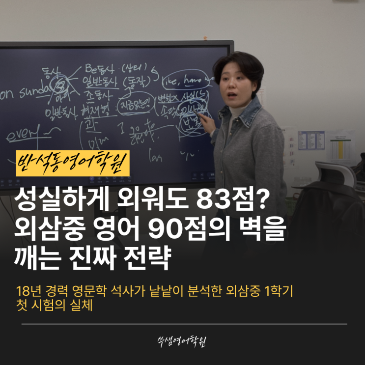 "내신 공부만 바짝 한다고 해서 외삼중 영어 90점을 넘길 수 있을까요? 냉정하게 말씀드리면, '아니오'입니다." 안녕하세요. 반석동 아이들의 영어 근력을 키우는 반석동영어학원 쑤샘영어학원 대표 채숙경입니다. 지난 시험 결과를 보고 많은 학부모님이 고민에 빠지셨습니다. 성실하게 교과서를 통째로 외운 아이들도 80점대 초반에 머무는 경우가 많았기 때문이죠. 오늘은 18년 경력의 영문학 석사인 제가, 외삼중 기출의 실체를 분석하고 그 해결책을 확실히 제시해 드립니다. [기출 총평] 외삼중 영어, '진짜 읽기 능력'이 필요합니다. 이번 시험은 단순히 문법을 묻는 수준을 넘어, 처음 보는 문장을 스스로....... <img src="https://blogthumb.pstatic.net/MjAyNjAyMjdfMTQ0/MDAxNzcyMTYzODgwODU3.1weiLG_n_yDKdIRHRDEFi9ZKvuu-fGWMiCMIf_JPCRAg.httoCEYVeotKAEt1yELNawds8JnEs1kisGnpOpdnE8gg.PNG/1.png?type=s3" />