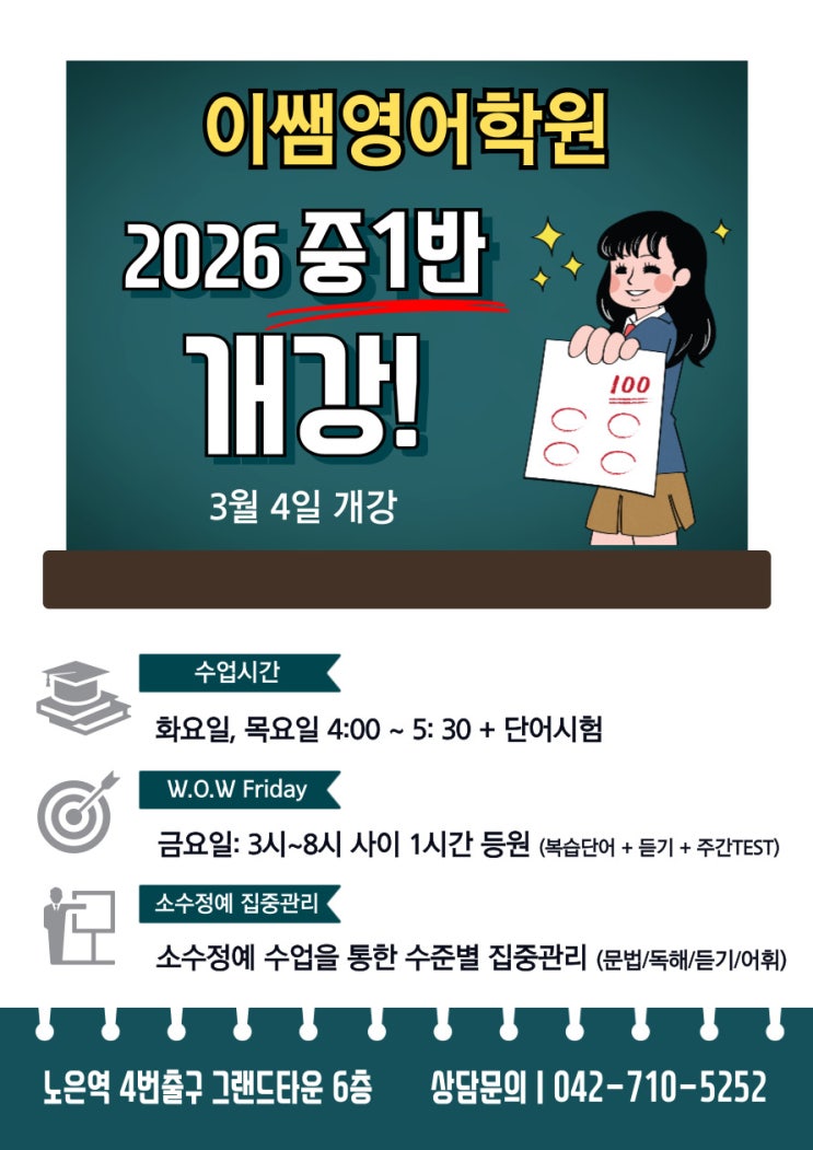 안녕하세요 노은 영어학원 이쌤영어입니다^^ 이쌤영어학원에서 3월달 중학교 1학년반을 개강합니다♥♥ 중1반 시간표 안내 시간: 화,목 4시 ~ 5시 30분 + 단어시험 이쌤영어학원 중1반이 특별한 이유 ↓↓↓↓↓↓ 탄탄한 기초부터 완벽한 심화까지, 이쌤영어학원만의 독보적인 커리큘럼 이쌤영어학원에서는 정확한 실력 파악을 위해 체계적인 초등/중등 레벨테스트를 진행합니다. 이를 바탕으로 <문법/독해/듣기/어휘> 영어의 4대 영역에 대한 약점을 파악하여 맞춤 학습을 제공합니다. 중학교 첫 내신 성적이 중요한 만큼, 노은중, 지족중 학생들을 위한 맞춤형 내신 대비를 철저하게 진행합니다. 그 결과, 유성구 지역 중학교에서 다수....... <img src="https://blogthumb.pstatic.net/MjAyNjAzMDFfMTA5/MDAxNzcyMjkxMDE5NjU5.ENb4OmFG0MapJNAHbO27TJGloUt6nbQDzZmSzx_VbWcg.NxNp75fUx3rwQuZBYf0I6eCTMoDr-Y0B7-akqmiZsyog.JPEG/%C1%A6%B8%F1%C0%BB-%C0%D4%B7%C2%C7%D8%C1%D6%BC%BC%BF%E4_-008_%289%29.jpg?type=s3" />
