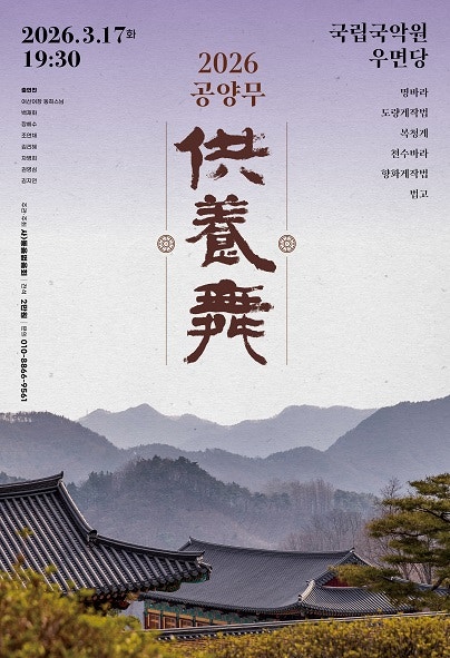 불법(佛法)을 몸으로 공양하는 의식무(儀式舞), 2026 공양무가 깊어진 봄밤 여러분을 찾아옵니다. 2026년 3월 17일(화) 오후 7시 30분 국립국악원 우면당 전석 2만원 문의 010-8866-9561 공양무(供養舞)란? 2018년 첫 무대를 올린 이후, 유발제자들의 수행과 배움이 켜켜이 쌓여 2026년 봄 또 한 번 깊은 울림의 무대를 준비했습니다. ✔ 나를 낮추는 공부 ✔ 몸을 통해 철학을 배우는 길 ✔ 인내와 정진의 시간 이번 무대는 어장 동희스님 의 가르침을 따라 제자들이 정성을 다해 올리는 수행의 무대입니다. 공연 프로그램 1. 명발(鳴鈸) 바라의 울림으로 법회의 시작을 알리는 엄정한 춤 2. 도량게작법(道揚偈作法) 도....... <img src="https://blogthumb.pstatic.net/MjAyNjAyMjhfMjQz/MDAxNzcyMjQwMjc5Njcy.WoEEkyLd1tE2sTck1iAOKBiH7LYRRWst-9rkGEVKB-cg.hGtuVEOuyrylIpHbGGx7QXMuBDTwB3BnbiAOb-07oLYg.JPEG/getImgLoad.jpg?type=s3" />
