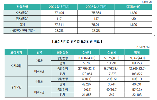 2027학년도 대입전형을 정확히 이해하는 것은 끝까지 포기하지 않는 고3 입시 레이스의 출발점입니다. 2027 대입은 큰 틀의 구조 변화보다는 수능 일정 이동과 수시 중심체제의 공고화, 의약 계열 선발 확대 등 세부 변수에 주목할 필요가 있습니다. 2027 대입의 핵심 키워드 5가지를 중심으로 현고3 수험생이 반드시 짚고 넘어가야 할 입시의 방향을 순차적으로 정리해서 연재합니다. 세 번째 키워드인 학생부 종합전형에 대해 알아봅니다. 세 번째 키워드, 학생부 종합전형의 핵심 전략 2027학년도 수시·정시 학생부종합전형 모집인원은 77,611명으로 2026학년도 76,011명보다 1,600명 증가하였습니다. 권역별 정원내와 정원외로 모집인원을 구....... <img src="https://blogthumb.pstatic.net/MjAyNjAzMDVfMTcw/MDAxNzcyNzAxMDYxMzg5.vGw7umghbvrUdwYEvRmMxsN52H9cXQOlIyt7h6ogvH8g.EqrNMruG75z8b-pa37D97WVdQKH-Hn1S6igMlxk1bO0g.PNG/2027%C7%D0%BB%FD%BA%CE_%C1%BE%C7%D5.png?type=s3" />