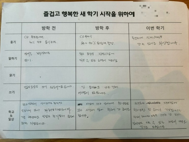 KnK어학원, 홈스쿨 과정중인 아이들의 부모님들을 위한 3월 첫주 화요일 브릿지 부모교육이 있었습니다. 초등학교 2학년 교과서도 집에 두고 아이와 활용하기로 했구요! 부모님들이 두 달간의 겨울방학을 보낸 후기도 간략하게 나누는 시간이 있었습니다 각자의 방학을 돌아보는 시간은 꼭 필요한 시간입니다 또 조를 이루어 우리집 이야기도 다른 부모님들과 나누기도 했습니다 이렇게 정성스레 우리의 겨울방학 홈스쿨이 완성되었습니다 방학 전 계획했던 것도 기억해보고 아이의 소소한 변화도 기록해 보면서 변화에 감사와 뿌듯함을 느끼는 시간이었습니다 초등 2학년 겨울방학 홈스쿨 기록: 정서적 안정과 시간의 여유가 불러온 만족할만한....... <img src="https://blogthumb.pstatic.net/MjAyNjAzMDVfNTMg/MDAxNzcyNjcyNTg0NzIx.vRG0tFbAO-TCmRfEGuHwmL5ao5jKfwSfsqBdLjE5afkg.pW1zP7QDW_IDFt5lGaDfipSBIfyzKWB9dQXGJAjxhvcg.JPEG/output%A3%DF1151964294.jpg?type=s3" />