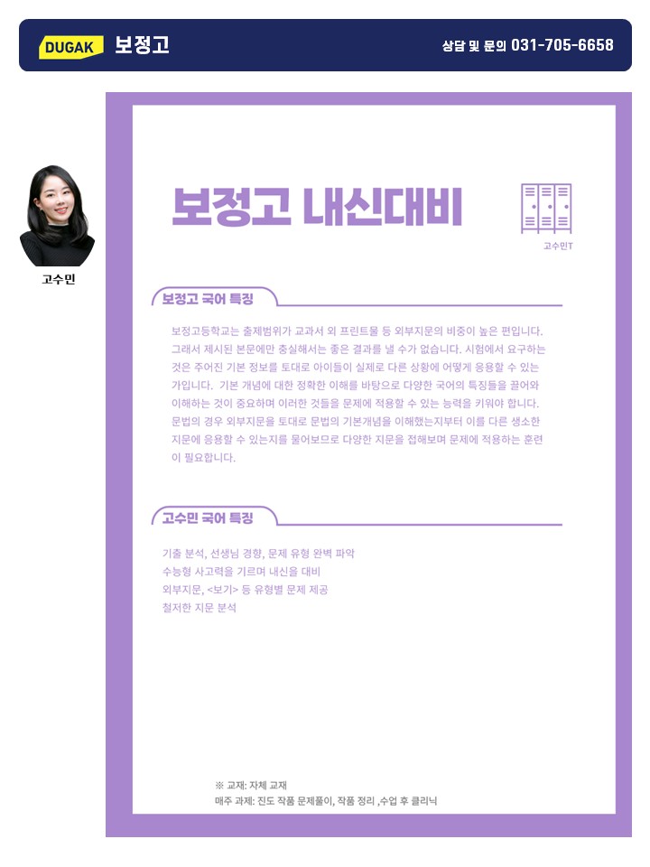 [분당두각] 고수민T 국어 고2 계원예고, 늘푸른고 / 고1 보정고 내신 시간표 및 커리큘럼