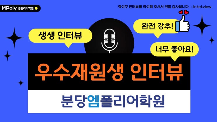 안녕하세요, 분당엠폴리어학원입니다. 지난 2025년 2학기, 학년별·레벨별 MPOLY 우수 재원생을 선정하여 인터뷰를 진행했습니다. 모든 질문에 정성껏 답변을 작성해 제출해 준 우리 학생들에게 진심으로 감사드립니다. 제출된 인터뷰 중 Best 인터뷰를 선정하여 작은 선물을 전달할 예정입니다. 감사합니다.❤️ <img src="https://blogthumb.pstatic.net/MjAyNjAzMDZfNzkg/MDAxNzcyNzk2NjQzOTY5.tec0HHv21R685NvhyHolTOTW0FAsPbpOeD1Geo6De_Mg.BrUbFs-aQajYvojCfJoL_VQeFMenaz0W1kPPlu350ikg.JPEG/%C0%E7%BF%F8%BB%FD%C0%CE%C5%CD%BA%E4_%C2%FC%BF%A9%C7%D0%BB%FD.jpg?type=s3" />