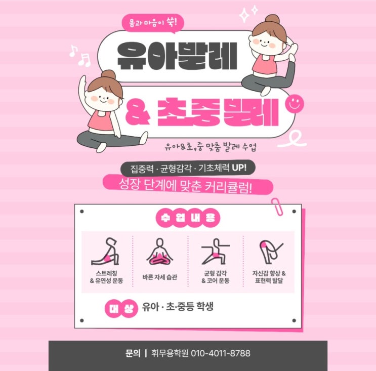 안녕하세요 휘무용학원 입니다 :) 왜 유아·초등 발레일까요? 성장기 아이들에게 가장 중요한 것은 ✔ 바른 자세 습관 형성 ✔ 기초 체력과 코어 강화 ✔ 균형감각 발달 ✔ 자신감과 표현력 향상 휘무용학원은 아이들의 발달 단계에 맞춘 맞춤 커리큘럼으로 수업을 진행합니다. 놀이 요소를 접목해 처음 발레를 접하는 아이들도 부담 없이 즐길 수 있어요 수업 내용 ✔ 스트레칭 & 유연성 운동 ✔ 바른 자세 습관 만들기 ✔ 균형감각 & 코어 운동 ✔ 자신감 향상 & 표현력 발달 몸과 마음이 함께 자라는 수업을 지향합니다 ⏰ 수업 시간 안내 유아발레 월 · 수 오후 5:40 초등발레 월 · 수 오후 3:30 주....... <img src="https://blogthumb.pstatic.net/MjAyNjAyMjdfMTAg/MDAxNzcyMTc2MTQ0MDg0.9hfNKCmvmXGt4uyw202CYT1i1dPeBbJNZc16heT6FLcg.Ps5aySY0Z7av2DdZ1JJYtMGytj0ngVy4KXp04FLJVKsg.JPEG/IMG%A3%DF6535.jpg?type=s3" />