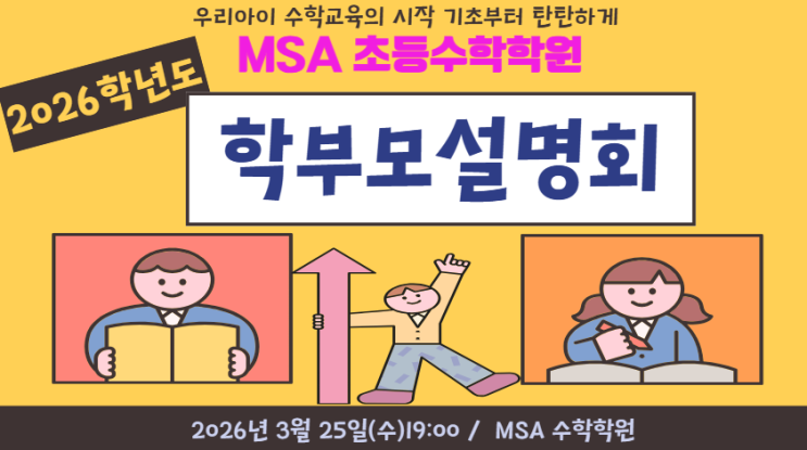 초등수학의 첫걸음 MSA 수학학원에서 2026년 학부모 설명회를 진행합니다. 학부모님들의 많은 관심 과 참여부탁 드립니다. 주변에 지인분들과 함께 오셔서 수학교육 관련 설명회도 참석하시고 좋은 시간 보내세요~~^^ ※ 한정된 좌석으로 반드시 사전 예약을 부탁드립니다. 미 예약 시 참석이 제한 될 수 있습니다. 대상: MSA 재원생 학부모님 & 수학교육에 관심 있으신 학부모님 일시: 2026년 3월25일(수) 19:00~ 장소: MSA 수학학원(롤링파스타 건물 2층)/ 주소- 북구 설죽로516 2층 접수: 학원 062-710-6656 원장님 010-4629-6656 전화 OR 문자 OR 카카오톡 신청 아이들이 계속 발전해 나갈수 있도록 재원생 한명한명 관심을 갖으며 사랑....... <img src="https://blogthumb.pstatic.net/MjAyNjAzMTNfMjkx/MDAxNzczMzgyMzU5MTc3.VlaVCMwzaTRS3G9mZM72MV06rd9m88t9OOK_9I9T7AYg.XcMPpp_Eo-HwZAhA_voAIcAbBRBlJChT1cfqQIEfb7Qg.PNG/20260313_150928.png?type=s3" />