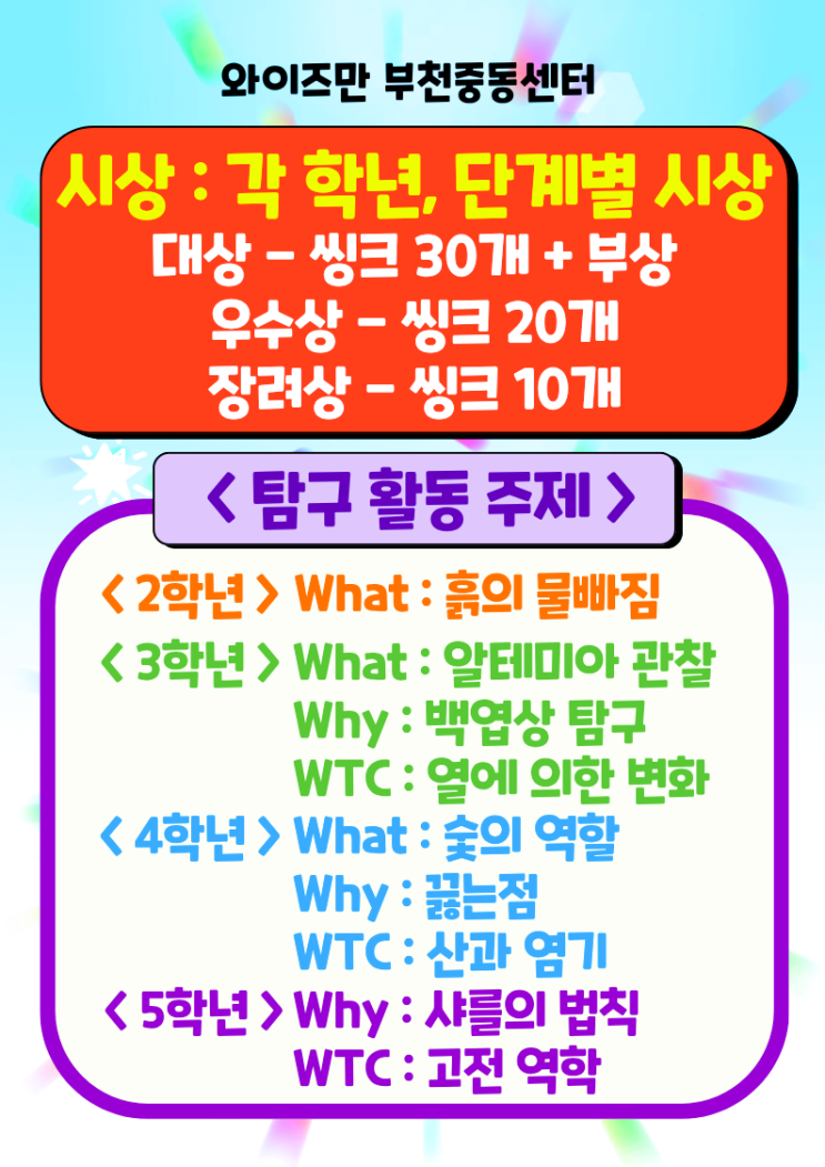 안녕하세요 와이즈만 부천중동센터입니다. 제1회 보고서 작성능력 뽐내기 대회가 진행됩니다. 학년, 단계별 탐구주제를 선정 해서 보고서를 기한 내 제출하면 됩니다. 자세한 내용은 하단 이미지 파일 참고 부탁드립니다 :) 감사합니다, <img src="https://blogthumb.pstatic.net/MjAyNjAzMTJfMTAy/MDAxNzczMjkxNTM3Njcx.Zx5BYsoR5LKrlD18Olb78Q4Zr2wb9uOG48c5ZcafMlgg.fattGJk3KzWzfGkGtxs1JrzlsiTyZEwExK8xcBZdDUgg.PNG/%C1%A6%B8%F1%C0%BB_%C0%D4%B7%C2%C7%D8%C1%D6%BC%BC%BF%E4._%284%29.png?type=s3" />