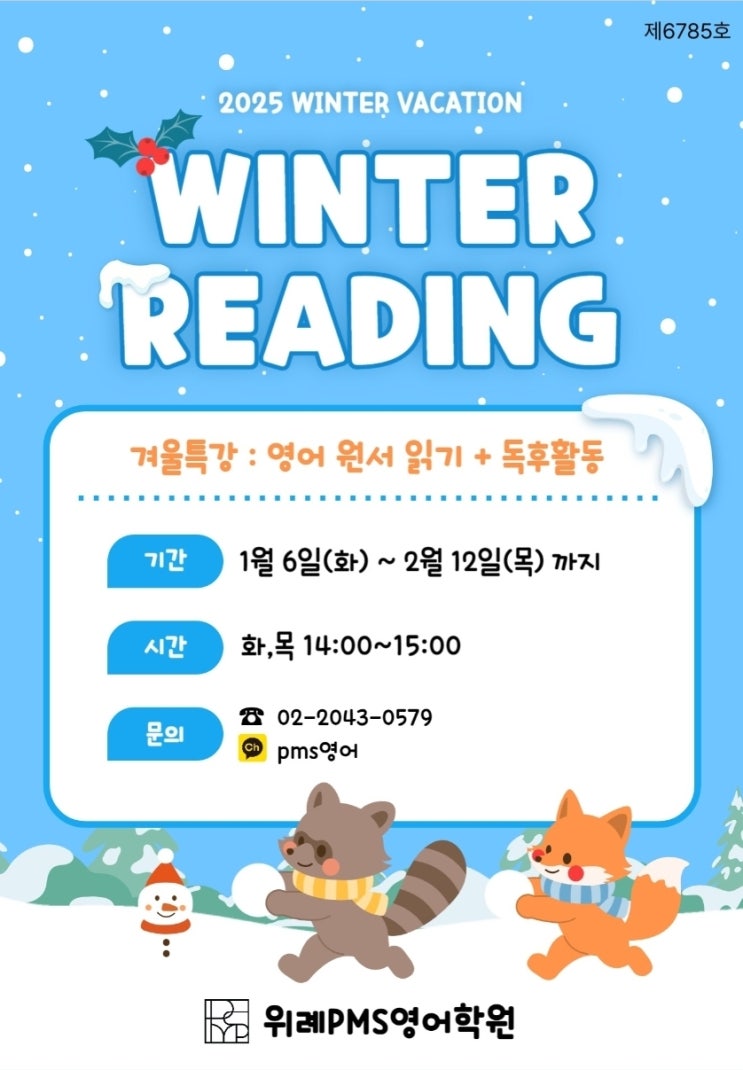 안녕하세요. 위례PMS 영어학원입니다. ^^ 얼마 남지 않은 2025년 한 해의 마무리와 유종의 미를 잘 거두고 계신가요?^^; 희망찬 새해가 다가오길 기대하며, 모든 근심과 걱정은 잠시 내려 두시고 남은 연말 연시 행복한 마무리 되시기를 바라겠습니다. 이제 우리 아이들의 겨울방학도 얼마 남지 않았는데요. 평소 우리 학생들이 독서량도 부족해 보이고 갈수록 문해력도 낮아지는 것 같아 항상 아쉬운 마음에서, 이번 방학에는 어떤 특강을 알차게 진행해보는게 좋을지 고민해 보았습니다. 이전에는 저희 원의 정규 프로그램과 특강에서 자주 원서를 읽고 독후활동을 하는 시간이 있어, 그래도 주에 몇 번씩은 접하곤 했었는데요. 학년이 올라가....... <img src="https://blogthumb.pstatic.net/MjAyNTEyMTZfNDIg/MDAxNzY1ODY5MzIxMjMy.GVCglUmpzHLFIqWrO9Tnkswl_Z1Y5Ud9Sx6HaCmpXT8g.mzQJnutofoT9Ef_HLoiXyRdtga4174d_lO9Y1g3Uickg.JPEG/Screenshot%A3%DF20251216%A3%DF155923.jpg?type=s3" />