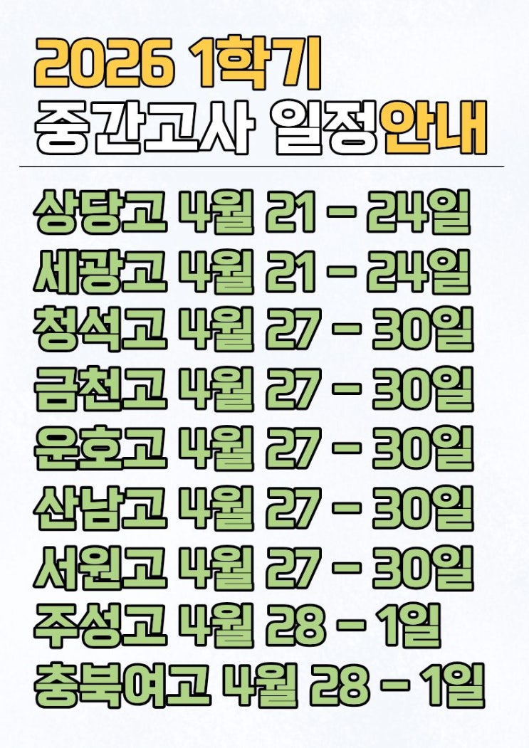 안녕하세요 김한규 영어학원입니다. 2026년 새학기 첫 중간고사 일정입니다. 궁금하신 사항은 김한규영어학원으로 문의바랍니다. 동남지구 김한규 영어학원 010-5188-2545 <img src="https://blogthumb.pstatic.net/MjAyNjAzMTVfMTIz/MDAxNzczNTY4MDY3MzQy.zm_OvNpnIlOI4YfORekA2Q0c7regfbVUwCTPQYFD4qMg.P82Hy-NwnEW5qpg3HvIGmGxTK2SseJrYvVXx-hOzrpgg.JPEG/%C1%A6%B8%F1%C0%BB_%C0%D4%B7%C2%C7%D8%C1%D6%BC%BC%BF%E4._%289%29.jpg?type=s3" />