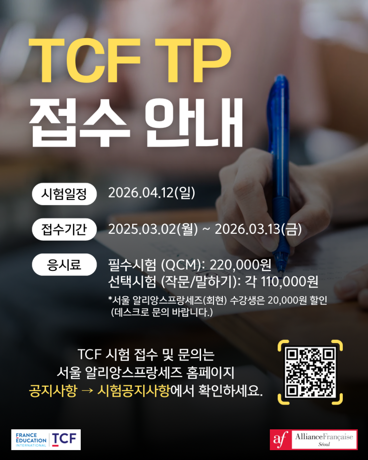 2026년 4월 12일 TCF TP 등록 안내! 4월 12일(일) TCF TP 시험 등록이 시작되었습니다. 접수는 3월 2일(월)부터 3월 13일(금) 17시까지 진행되니 늦지 않게 등록해주세요! ✅서울 알리앙스프랑세즈(회현) 수강생은 20,000원 응시료 할인이 적용되니 데스크로 문의 바랍니다. 자세한 사항 및 시험등록은 아래 서울 알리앙스프랑세즈 홈페이지를 클릭해 주세요 https://afseoul.or.kr/bbs/board.php?bo_table=yb_board02&wr_id=2 <img src="https://blogthumb.pstatic.net/MjAyNjAzMDNfMjc0/MDAxNzcyNDk3NjgxMTc2.CNkjJia1vDcaSXBD0GtydPFi_t8sQ6NTnukDQL-Ctw8g.TZ8tHas_7lf0hCVAtImRWVzBcXc1TNFipElvwlJRVbQg.PNG/KakaoTalk_20260303_092459341.png?type=s3" />