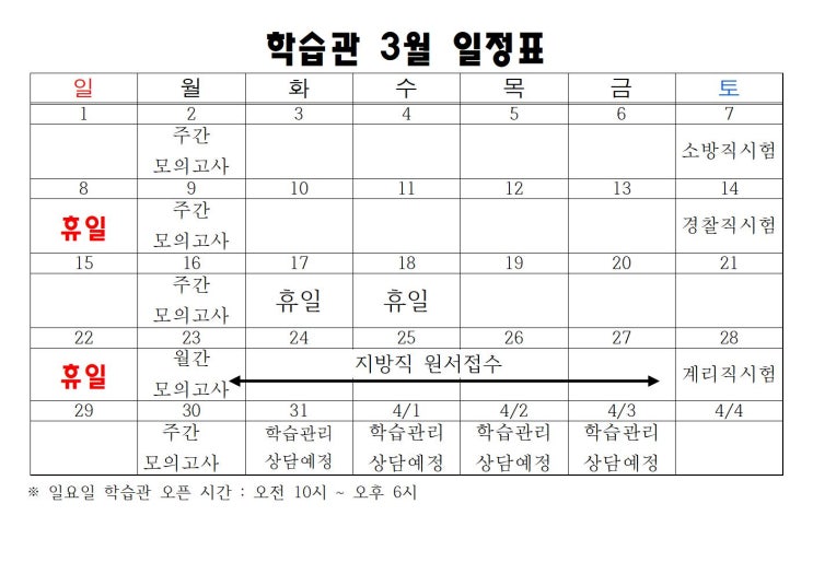 안녕하세요~ 박문각공무원학원 3월 일정입니다. [순천공무원학원] 박문각공무원학원 (T:725 - 0555) <img src="https://blogthumb.pstatic.net/MjAyNjAyMjZfMjQ4/MDAxNzcyMDg2MzI4NDI2.mzf6LRgjWF4DhhtjD5CZTRJS1efX1xDtf36L2f6JUS8g.GSd6-Hwtga_PYzTLBJrqAgASOhi7TonVD43SETzdPc8g.JPEG/3%BF%F9%C0%CF%C1%A4%C7%A5001.jpg?type=s3" />