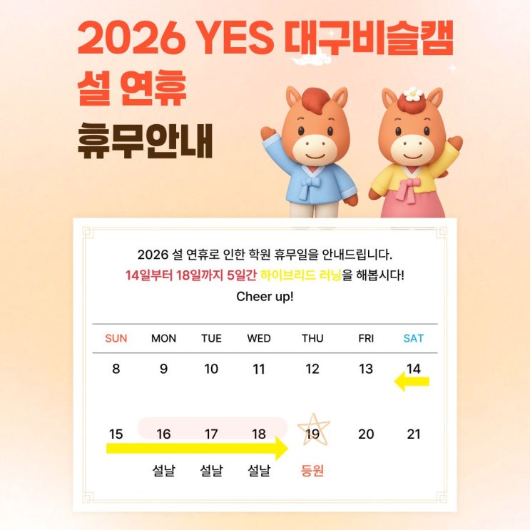 안녕하세요, 대구 비슬초 앞에서 초등 영어를 가르치고 있는 텍폴 윤선생 우리집앞영어교실 예쓰 엘리쌤입니다. 곧 있으면 설 연휴가 다가오는데요. 주말까지 쉬면 5일을 쉴 수 있는 꽤나 긴 연휴가 되겠네요. 저희 원도 16일 월요일부터 18일 수요일까지는 수업이 없습니다. 19일 목요일에 등원하여 열심히 공부하겠습니다. 2월의 개강일은 2일 월요일, 종강일은 3월 5일 목요일로 연휴가 있지만 수업 시수에는 영향이 없으니 걱정 안하셔도 되세요. 방학이나 명절과 같은 연휴가 되면 아이들이 영어 학습을 쉬게 되어 영어의 감이 떨어질까봐 걱정하시는 학부모님들 계시죠? 저희 원에서는 아이들이 자발적으로 매일의 영어학습의 힘을 기르게....... <img src="https://blogthumb.pstatic.net/MjAyNjAyMTBfMjg0/MDAxNzcwNzE0MTk0OTM4.EZFjkPkLtqj_Ui9RwqGacUiC9xgfNsqqKzyfIe6Vk9cg.P8HXx015W9ZV6wVfBGn5U9seqtIeQdIVwLCS-_Z__OYg.JPEG/%C1%A6%B8%F1%C0%BB_%C0%D4%B7%C2%C7%D8%C1%D6%BC%BC%BF%E4..jpg?type=s3" />