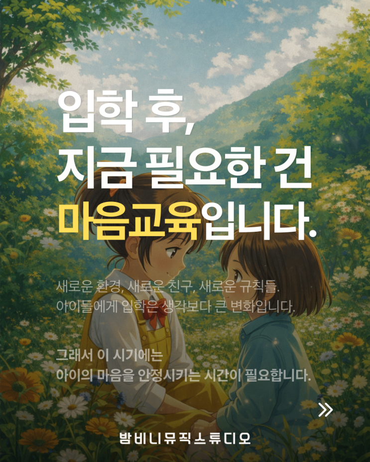 입학 후 아이들에게 가장 필요한 교육 3월이 지나면서 아이들은 조금씩 새로운 생활에 적응하기 시작합니다. 유치원, 초등학교 입학은 아이들에게 매우 큰 변화입니다. 새로운 친구들, 새로운 규칙, 처음 경험하는 환경 속에서 아이들은 생각보다 많은 에너지를 사용하게 됩니다. 그래서 이 시기에는 성취 중심의 교육보다 아이의 마음을 안정시키는 시간이 필요합니다. 교육 전문가들은 말합니다. 아이의 성장에는 정서적 안정이 매우 중요한 역할을 한다고 합니다. ⠀⠀ ⠀⠀ 마음이 안정될 때 집중력이 생기고 자신감이 자라며 배움에 대한 즐거움도 함께 생기기 때문입니다. ⠀⠀ ⠀⠀ 이런 점에서 음악교육은 아이들에게 매우 좋은 활동....... <img src="https://blogthumb.pstatic.net/MjAyNjAzMTlfMTEy/MDAxNzczODk1MjY2NjQx.4VHoud11pKD8OIQgl3_EMuaTc2IGrEQLDacp5VihgcUg.jS9qyIu5dC-4CtzALXAA5IWS9ebc052B8gu5vuFVipMg.PNG/KakaoTalk_20260318_173235988.png?type=s3" />