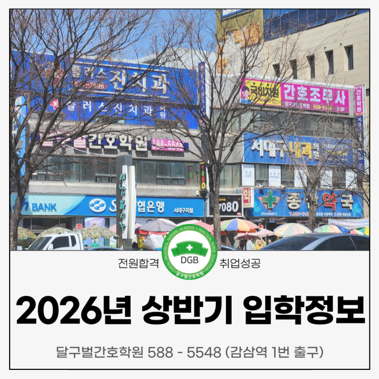 안녕하세요 ! 감삼역, 서남시장 입구에 위치한 '달구벌간호학원' 입니다 :-) 혹시 간호조무사 자격증 준비를 고민하고 계신가요 ? 간호조무사 자격증은 10개월 이상 시간을 쏟아야 취득할 수 있기 때문에 대구간호학원 선택이 더 어렵게 느껴지실 것 같아요 ! 이런 고민을 하는 분들께 달구벌간호학원 2026년 상반기 간호조무사 국비반 입학 정보를 꼼꼼히 알려드릴게요♥ 달구벌간호학원 간호조무사 자격증 훈련과정은 [훈련기간 : 26년 4월 20일 ~ 27년 3월 3일] 학원 내 이론수업 하루 7시간, 9시30분 ~ 16시20분 (106일)과 병원 내 현장실습 하루 8시간, 8시50분 ~ 17시 (98일)으로 총 204일 (약 10개월) 동안 교육이 진행되어요 ✔....... <img src="https://blogthumb.pstatic.net/MjAyNTExMTdfNzMg/MDAxNzYzMzYxMTY0ODQw.NE7oNlE0F6NQIOar3zBT7Vl6UXH0NSXHDrOT3TaSZSwg.7UM3U3yjqXLZHiXtIQWAquLe_2GDybOmu4C30aTP0tQg.PNG/%A1%DA%C7%D0%BF%F8-%BA%ED%B7%CE%B1%D7%C1%F6%C1%A4-%BD%E6%B3%D7%C0%CF%A1%DA-001_%2812%29.png?type=s3" />