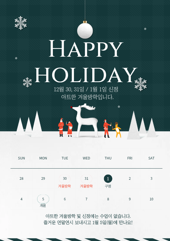 안녕하세요~ 아트한미술입니다 ^^ 어느덧 이렇게 한해가 훌~쩍 지나가버리네요 ㅎㅎ 올해를 돌아보니 우리 아트한 친구들은 무럭무럭 성장한 한 해였던 것 같습니다. 그래서 그런지 다가올 한해도 정말 기대되네요. 내년도 으쌰으쌰 파이팅 해봅시다!! 열심히 달리려면 쉴 때도 있어야겠죠?? 아래 날짜에 맞추어 아트한도 겨울방학을 가지려합니다. 1월 5일부터 정상 등원이니 참고해주세요 ^^ 즐거운 연말연시 보내시고 모두 1월 5일에 만나요~! <img src="https://blogthumb.pstatic.net/MjAyNTEyMTVfMTk4/MDAxNzY1ODA3ODE4NjEz.l1uuIByjVQubogfsRTVNVrlx0mO457QOtymz258g4fUg.apm1osF173VCRLEC350x0KvTl8lqB9qRXciTOmmCjnwg.PNG/%BE%C6%C6%AE%C7%D1_%B0%DC%BF%EF%B9%E6%C7%D0_%B0%F8%C1%F6.png?type=s3" />