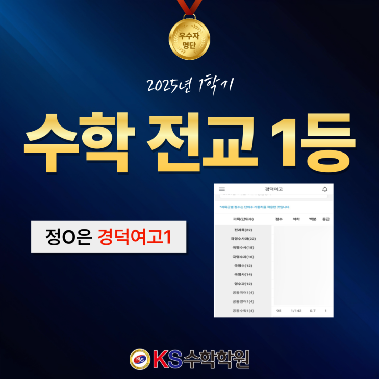 안녕하세요? 인정받는 수학학원! 월성동수학학원 KS수학학원입니다! 오늘은 KS수학학원에 재원 중인 재원생들이 학교 내신 시험에서 얼마나 좋은 결과를 얻고 있는지 알려드리고자 합니다^^ 학생들과 함께 노력한 결과가 점수로 드러나는 순간은 매번 떨리기도 하고 설레기도 합니다!!! 우리 KS수학학원 재원생들이 2025학년도 1학기에서도 아주 눈에 띄는 성과를 보여주었습니다!!! KS수학학원은 항상 결과로 말합니다^^ 오늘 소개해 드릴 학생은 경덕여자고등학교 1학년 정O은 학생입니다! 2025학년도 1학기에서 수학 전교 1등!!! 경덕여자고등학교 1학년 정O은 학생에게 아낌없는 칭찬과 박수를 보냅니다^^ 우리 정O은 학생 너무 기특하고 자....... <img src="https://blogthumb.pstatic.net/MjAyNTEyMThfNzgg/MDAxNzY2MDM1OTc0NTkx.i629-T-NTI1Mh0zddqRXES8xGEQJu3Fkt9Eubnh6ouog.kxDENlFsNhkm_KZwHPK04Kmp5UWKj0V_dpkcOltehnog.PNG/%BC%BA%C0%FB%BF%EC%BC%F6%C0%DA-%C0%DB%BE%F7-_-1_%BA%B9%BB%E7%BA%BB-013.png?type=s3" />