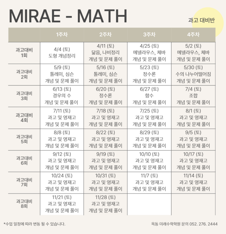 미래수학입니다 울산과학고 입시반 개강합니다 <울산과학고 대비반> [수업시간] 4월4일부터 매주 토요일 오후 6-8시 7월부터 월요일 추가수업 : 자소서 작성 및 실전면접연습 [수업 내용] 4월~7월: 중학도형 기본 개념 및 응용 , 올림피아드 기본 이론 및 문제풀이 (정수론, 조합,기하,대수) 자소서 작성 8월~11월: 자소서 첨삭 중등부 전반의 수학 점검 1차 면접대비 24년, 25년 전국 과학고 및 영재고 기출문제 풀이 및 발표 2차 면접대비 [강의 계획서] 매년 최선을 다해 준비하여 인원수 대비 높은 합격률을 보였습니다 올해도 과학고 준비는 미래수학입니다 <img src="https://blogthumb.pstatic.net/MjAyNjAzMTFfNjQg/MDAxNzczMjE5OTM5Mjc0.kFtYIg7ahvNnnC7YrX94O6P5yh5SE9FMq5ouwz585YQg.ttWrEh5ulsAds-6bHNUP6gTq4RNqzXumM79DnK7ngo8g.PNG/KakaoTalk_20260311_165947025.png?type=s3" />