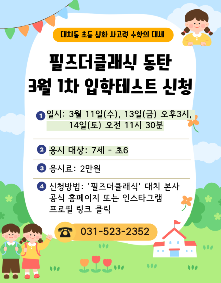 안녕하세요! 3월 1차 입학테스트 신청을 오픈하였습니다.✨ ✔️ 응시 일시: 3월 11일(수), 13일(금) 오후 3시, 14일(토) 오전 11시 30분 ✔️ 응시 대상: 7세(2020년생) - 초6 ✔️ 응시료: 2만원 ✔️ 신청 방법: '필즈더클래식' 대치 본사 공식 홈페이지 또는 아래 링크 클릭 ☎ 교육 문의: 031-523-2352 필즈더클래식 동탄센터의 소식을 가장 빠르게 확인 하실 수 있는 공식 인스타그램 계정 안내드립니다. <img src="https://blogthumb.pstatic.net/MjAyNjAyMjZfMjYw/MDAxNzcyMDg3MjA0MjQ2.VBW7EiLmAlzgOTSqHYwUjewxTfHrILc-LvtWaZfIUl4g.3ZjLE3vR4YQ77-8nndB6dq5RLHE-oluHO3poyVwb51Ug.PNG/3%BF%F91%C2%F7%C0%D4%C7%D0%C5%D7%BD%BA%C6%AE.png?type=s3" />