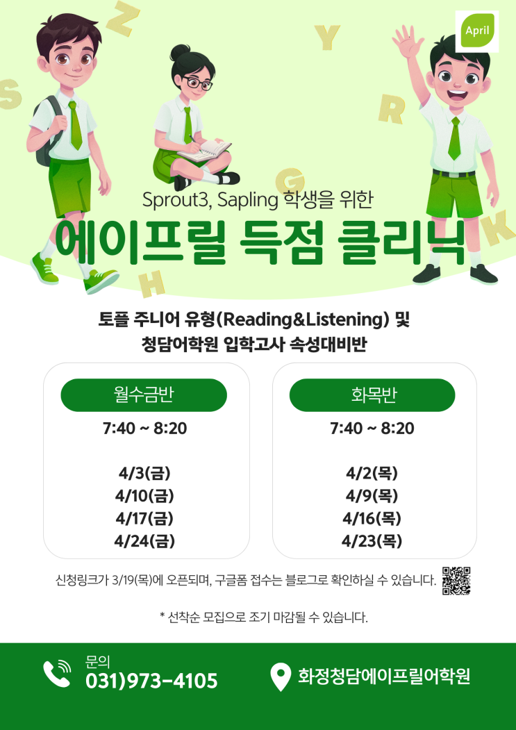 안녕하세요, 화정청담 에이프릴어학원입니다. 새 학기가 시작되고 우리 아이들이 새로운 레벨에 적응하며 열심히 공부하고 있는 요즘입니다. 다가오는 4월, 우리 Sprout3, Sapling 학생들이 한 단계 더 높은 목표를 향해 도약할 수 있도록 특별한 프로그램을 준비했습니다. [에이프릴 득점 클리닉] 상급 레벨 진학의 관문인 '청담 입학고사'와 '토플 주니어'를 완벽하게 대비할 수 있는 기회입니다. 에이프릴 득점 클리닉 프로그램 안내 이번 클리닉은 실전 감각을 익히고 부족한 유형을 보완하는 데 집중합니다. 수업 대상: Sprout3, Sapling 재원생 수업 내용: * TOEFL Junior 유형(Reading & Listening) 완벽 분....... <img src="https://blogthumb.pstatic.net/MjAyNjAzMTFfMjEx/MDAxNzczMjI4MDQ2MDIz.4FfAy_oEhQOTNq6eXYlT2gl5ZCWSz4AENVe5l7NS4-Ug.8HpoeSUXaujw2sxgPThzRP6q098h_qOcAbyNUp-ZPKAg.PNG/applicationmiri-canvas-node_%285%29.png?type=s3" />