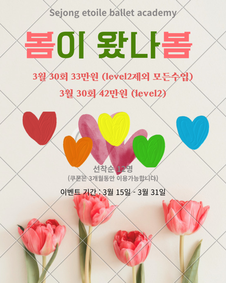 안녕하세요 세종 에뚜왈 무용 학원입니다~ 3월 봄을 맞이하여 이벤트를 진행합니다. 기간 내에만 신청이 가능하오니 꼭 할인 혜택을 받아 신청하세요^^ 3월 30회 33만 원(level2 제외) 3월 30회 42만 원(level2) 선착순 12명 3월 등록 시, 3개월 이내에 사용 가능한 쿠폰입니다. ·상담 및 문의· 전화번호:031-979-8084 Instagram: @sejongedduwa ·주소· 경기도 고양시 덕양구 화중로 32-37 에덴다모은정 주상복합아파트 2층 Sejong Etoile Dance Academy <img src="https://blogthumb.pstatic.net/MjAyNjAzMThfMTI0/MDAxNzczODA5NTc5MzI5.b6KO1TWyP7B-QakCCD5GWsh3XUYuWa451vsrAviWxOsg.-YF7iCDI07JKNnUi6-hzEdFHYUbT1QvDoKn4oODJBF8g.PNG/%C7%CE%C5%A9_%B1%D7%B8%B0_%B9%CC%B4%CF%B8%D6%C7%D1_%C6%AB%B8%B3_%BA%BD_%C7%D2%C0%CE_%C0%CC%BA%A5%C6%AE_%C0%CE%BD%BA%C5%B8%B1%D7%B7%A5_%C6%F7%BD%BA%C6%AE.png?type=s3" />