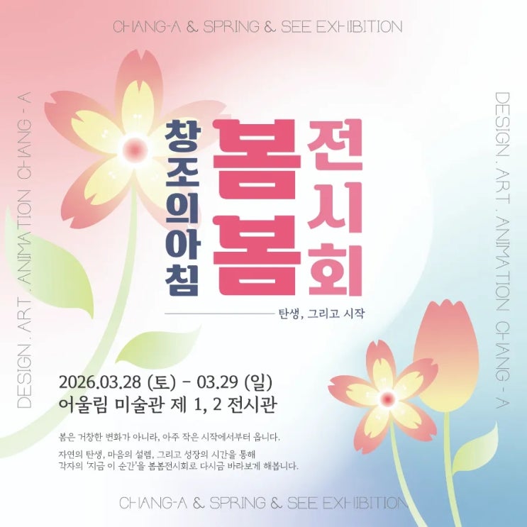안녕하세요 , 햇살이에요 ! 따뜻한 봄바람이 불어오는 요즘 , 아이들과 함께 준비해온 전시가 드디어 !! 완성되어가고 있어요 작은 손으로 시작된 작품 하나하나가 여러 번의 고민과 색을 거쳐하나의 작품으로 완성되기까지 그 모든 과정을 담은 [ 봄봄 전시회 ] 를 준비했습니다 ✶ 일정 : 2026년 3월 28일(토) ~ 3월 29일(일) ✶ 시간 : 10:00 ~ 18:00 ✶ 장소 : 어울림 미술관 제1 , 2전시관 꼭 한 번 , 와서 봐주세요 사진으로 보는 것과 직접 마주하는 작품은 느낌이 정말 다르거든요 아이들의 시간과 마음이 담긴 작품들을 직접 만나보실 수 있는 자리입니다 ✨ 아이들의 시선으로 담은 이번 봄 전시는 아이....... <img src="https://blogthumb.pstatic.net/MjAyNjAzMTlfMjEg/MDAxNzczODk5MDc0NjMw.2x8s4gyAp-R9IxGrXkxGd9v7M3siEfnLG4wWotZg_OMg.qCaXj8GMs_8NLNQFdGq4f-KJn_Wuh-L_AsJTNuLCFhog.JPEG/900%A3%DF1773884001835.jpg?type=s3" />