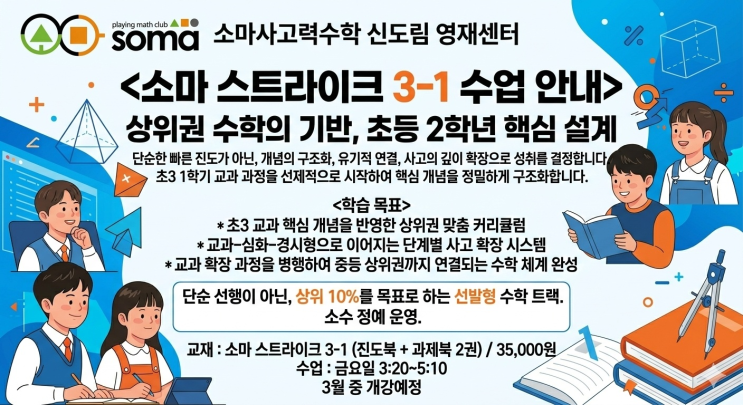 안녕하세요. 소마사고력 수학 신도림 영재센터입니다. <소마 스트라이크 3-1 수업 안내> 상위권 학생들의 수학은 단순한 빠른 진도로 완성되지 않습니다. 개념을 구조화하고, 원리를 유기적으로 연결하며, 사고의 깊이를 확장하는 훈련에서 성취가 결정됩니다. 초등 2학년은 곱셈·분수·도형을 넘어 중등 수학으로 이어지는 수학적 사고 체계를 설계하는 핵심 단계입니다. 이에 따라 초3 1학기 교과 과정을 선제적으로 시작하여 교과 핵심 개념을 정밀하게 구조화하고, 상위권 수학의 기반을 체계적으로 완성해 나갑니다. <학습 목표> *초3 교과 핵심 개념을 반영한 상위권 맞춤 커리큘럼 *교과–심화–경시형으로 이어지는 단계별 사....... <img src="https://blogthumb.pstatic.net/MjAyNjAyMjhfMTcg/MDAxNzcyMjc3MDU3NzY0.7WCZsfqMejk0WbXAeonDg4nlo2aVwQBrcEYkmWrTEhog.DCbbKU46xuwebPFw5QBhSvMIQSZtUVi8lkGMhRGm-rcg.PNG/image.png?type=s3" />