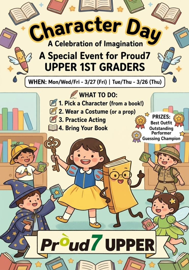 프라우드7 UPPER 1학년 ✨ Character Day 안내 ✨ 안녕하세요, 프라우드7 UPPER입니다 :) 첫 번째 Big Test를 마친 우리 1학년 학생들과 함께 책 속 인물로 변신해보는 특별한 시간, Character Day를 진행합니다! 아이들이 즐겁게 참여하며 책에 대한 흥미와 표현력을 키울 수 있는 활동이니 많은 관심 부탁드립니다 일정 안내 ✔ 월·수·금반 : 3월 27일 (금) ✔ 화·목반 : 3월 26일 (목) 대상: 프라우드7 UPPER 1학년 학생 준비 사항 ✔ 캐릭터 선정 Into Reading 또는 좋아하는 동화/소설 속 인물 ✔ 의상 및 소품 캐릭터를 표현할 수 있는 의상 또는 소품 간단한 포인트 아이템도 충분해요! ✔ 연기 연습 캐릭....... <img src="https://blogthumb.pstatic.net/MjAyNjAzMjBfMjkg/MDAxNzc0MDAwMDA2NDU0.9JMDTL-v5tqs4igywXzdZcI16iIukKrvcE8Yd5GsvoMg.vll37Hg_mNsUCzhVmuha1jIEKzUk1U4r6r3yyRGU_WUg.PNG/Character_Day.png?type=s3" />