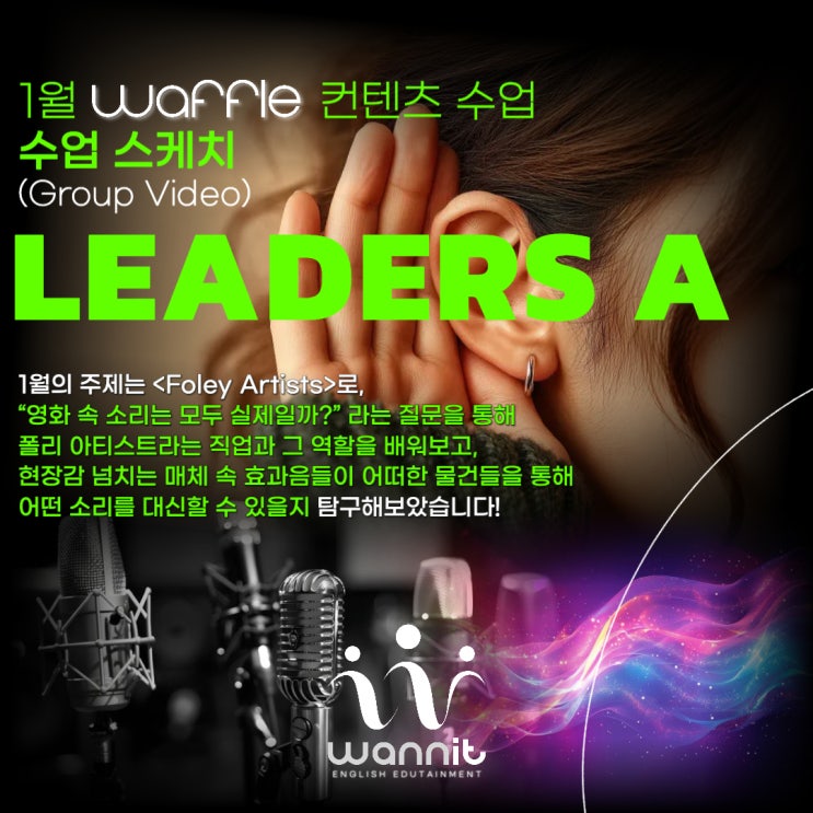 송파구 가락동에 위치해 경험위주의 커리큘럼으로 언어로써의 영어 교육을 오늘도 고민하고 또 고민하는! 초등·중등 전문 영어학원 WANNIT(워닛) 영어학원입니다. 워닛(WANNIT) 영어학원은 매 월 과학, 인문, 예술, 역사, 문화에 따른 신선한 주제를 선정하여 한 달간 심도있게 탐구할 뿐만 아니라, 관련된 현장학습을 찾아 떠나기도 합니다! Leaders A반의 이번 1월 <Want to Know> 수업 주제는, 영화 속 ‘가짜 소리’를 만드는 사람들, <Foley Artists> 였습니다! 이번 1월, Leaders A반 아이들은 "영화 속 소리는 모두 실제일까?” 라는 질문을 통해 폴리 아티스트(Foley Artist)의 역할을 배워보았습니다. 눈 위를 걷는 소....... <img src="https://blogthumb.pstatic.net/MjAyNjAzMDZfMjE1/MDAxNzcyNzg1NTE2MDc2.M0IvixcD0MqXVN7FhfnnsqT7vDgPg93k06muRVioe_Yg.QWzpuLsfJ8NP1Z00lBOSAo9OpqS_SG2F_TJkLKR6_4Yg.JPEG/%BA%ED%B7%CE%B1%D7_%BD%E6%B3%D7%C0%CF_ver_2-100.jpg?type=s3" />