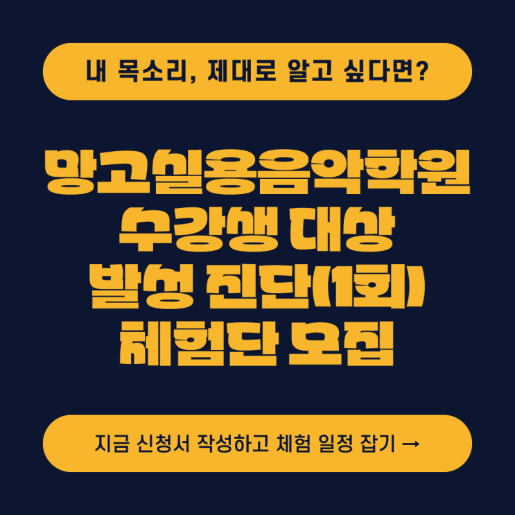 안녕하세요. 여러분! 노란 망고입니다~ 오늘은! 저희 망고실용음악학원의 모든 수강생분들께 해당되는 특별한 체험단 모집으로 찾아왔어요! 바로바로... 수강생 대상 발성진단 입니다!!! 그 동안 보컬 레슨은 받아보고 싶은데, 여러가지 이유들로 망설이셨던 분들 계셨다면?! 혹은 내 목소리에 대해서 제대로 알고싶으셨다면?! 이번 기회에 체험단 신청해보세요!!! 자세한 건 아래의 이미지들 천천히 읽어봐주세요!!! 관심있으신 수강생분들은 아래의 발성 진단 체험 신청서를 작성해주세요! 링크를 누르시면 신청 폼으로 이동합니다! https://forms.gle/nHW6R65yxPrt7VoE9 그럼, 노란 망고는 또 다른 소식으로 여러분들을 만나러 올게요! (해당....... <img src="https://blogthumb.pstatic.net/MjAyNjAyMjRfNiAg/MDAxNzcxOTMzNzY5MjU3.OpRIlD1_B202BiQfj97UBqefz9fwVlQdeDJuXWy_EXQg.yGT2zO5lVod5bBlvXQMi0zgHEFE8JrYtUeSUVgtwLDIg.PNG/KakaoTalk_Photo_2026-02-24-20-49-19_001.png?type=s3" />