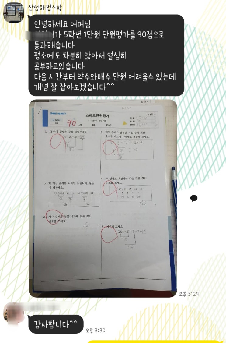 안녕하세요. 삼성플러스해법수학 원장 정효순입니다. 오늘은 저희 학원에서 진행 중인 단원평가 관련한 글을 써보고 꼭 단원평가를 보는 중요성에 대해 공유해보도록 하겠습니다^^ 저희 학원에서는 단원 학습이 끝나면 단원평가를 통해 학생들의 이해도를 점검하고 있습니다. 점수만을 확인하는 시험이 아니라, 아이들이 개념을 얼마나 정확히 이해했는지 확인하는 과정입니다. 저희 삼성플러스해법수학은 모든 학생들이 공부한 단원이 마무리되면 단원평가를 통해 학습 내용을 꼭 확인합니다. 시험 결과를 통해 개념 이해도 계산 정확도 문제 해결 과정을 꼼꼼히 확인합니다. 오답 분석과 개별 지도 (빨간 동그라미 표시된 시험지 사진) 시험이....... <img src="https://blogthumb.pstatic.net/MjAyNjAzMTJfOTkg/MDAxNzczMjc2NjIzODAz.46w2bhP9UH9fCZUfzTuHKCsk9-SGOtpaZ5rqbLkZJSgg.KN3fMcVnDxhSa1ralzk654-WFIXK3mcYj82dWDw05XQg.JPEG/KakaoTalk_20260312_094153426.jpg?type=s3" />