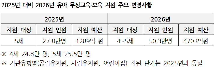 2026년 기준 유치원과 어린이집 무상 교육 및 보육 대상은 4∼5세