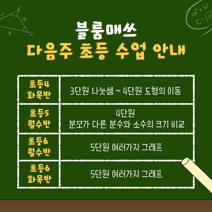 다음주 진행 될 초등 수업 일정입니다 ^^ <img src="https://blogthumb.pstatic.net/MjAyNjAyMTlfMTI5/MDAxNzcxNDk4MTA2NTQ3.pndEWcd5ff9FJU5Ooxo0nlCY5CtzuITGY1Pw3k0QxvMg.P2VCMNEJEcOzNoP7ydtP4CH9qeRTULJF5m4XJrNvIhMg.JPEG/2%BF%F9_4%C1%D6%C2%F7_%C3%CA%B5%EE_%BC%F6%BE%F7_%C0%CF%C1%A4.jpg?type=s3" />