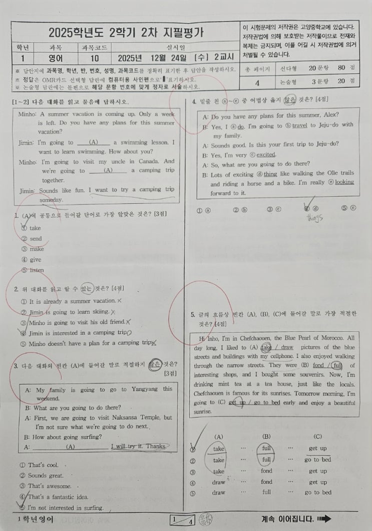 지난 8월에 중2 친구들을 졸업시키고 중1 친구들이 첫 기말고사를 봤어요^^ 첫 시험은 실수도 하고, 답지도 밀려쓰고, 시간계산을 못해 답안제출때 다 못 적어 내기도 하고.... 이런 실수도 해 봐야 다음 시험 때는 그럴 경우의 수가 준다고 생각해요^^ 하지만 다행이 영어는 100점을 맞아준 우리 1학년 친구들^^ 당연한 결과라기 보다 평소 늘 문제읽기 실수를 하는 덜렁이 친구들이 "실수만 하지 말자"라는 마음으로 시험에 임해줘서 대견했습니다. <img src="https://blogthumb.pstatic.net/MjAyNTEyMzFfMTcg/MDAxNzY3MTA5NTYyODc4.RLaFLFvQV3W7NAeuM-RDVkdVXUFX5YSMUf882x2ksa4g.mlCmgkQuopDPis1pf4WXLHGSnoKnTK_-aVS3kma10-0g.JPEG/900%A3%DF20251230%A3%DF131421.jpg?type=s3" />