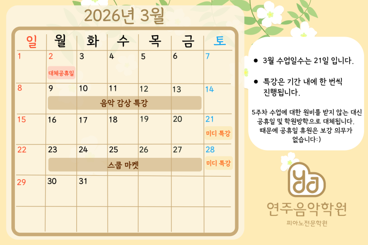 안녕하세요! 연주음악학원 3월 일정 안내드립니다 이번달은 음악 감상 특강과 스쿱 마켓이 진행됩니다~!! <img src="https://blogthumb.pstatic.net/MjAyNjAzMDNfMjgy/MDAxNzcyNTA0NDEwNDky.wCP3VdPNwxIVAbX1o0nFAflE2VqQ_GG4YZneTLo1AZ0g.snIv-qhU2ejs_xdna1jTotC_5LQV-C5G7mFsDsqQ11kg.PNG/024.png?type=s3" />