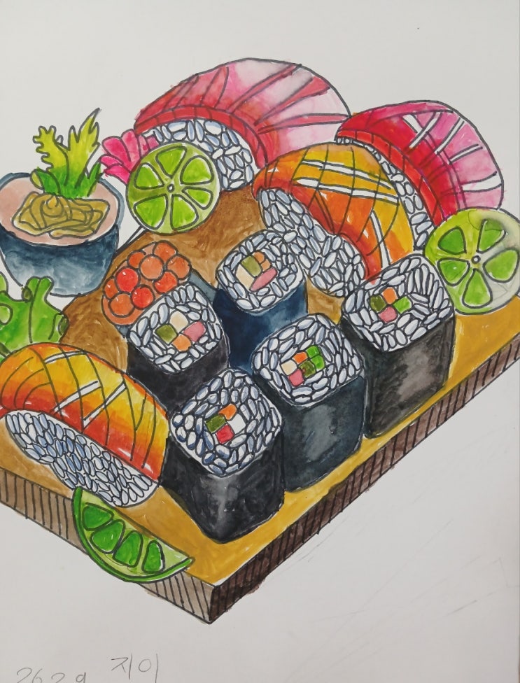 구리홍익미술학원에서 초등 저학년 아이들 그림 입니다~ 음식을 주제로 그렸는데 주로 초밥을 그렸네요~ 미술한지 얼마 안된 친구들인데 멋지게 잘 표현 하였네요~ 차츰 멋진 작품 기대됩니다~ 모두 즐감 하시고 하트뿅 눌러주세요~^^ <img src="https://blogthumb.pstatic.net/MjAyNjAyMjZfMjQx/MDAxNzcyMDc0NzIyNDc4.XGPBljOuqOaJBOFyvyBumWfJzHz7IPW1XN2ERxdDugIg.EZWZxmN1mxaV6ACu515sOpRpEm2x1cDQR7sZpvWTjk4g.JPEG/900%A3%DF20260209%A3%DF150037.jpg?type=s3" />