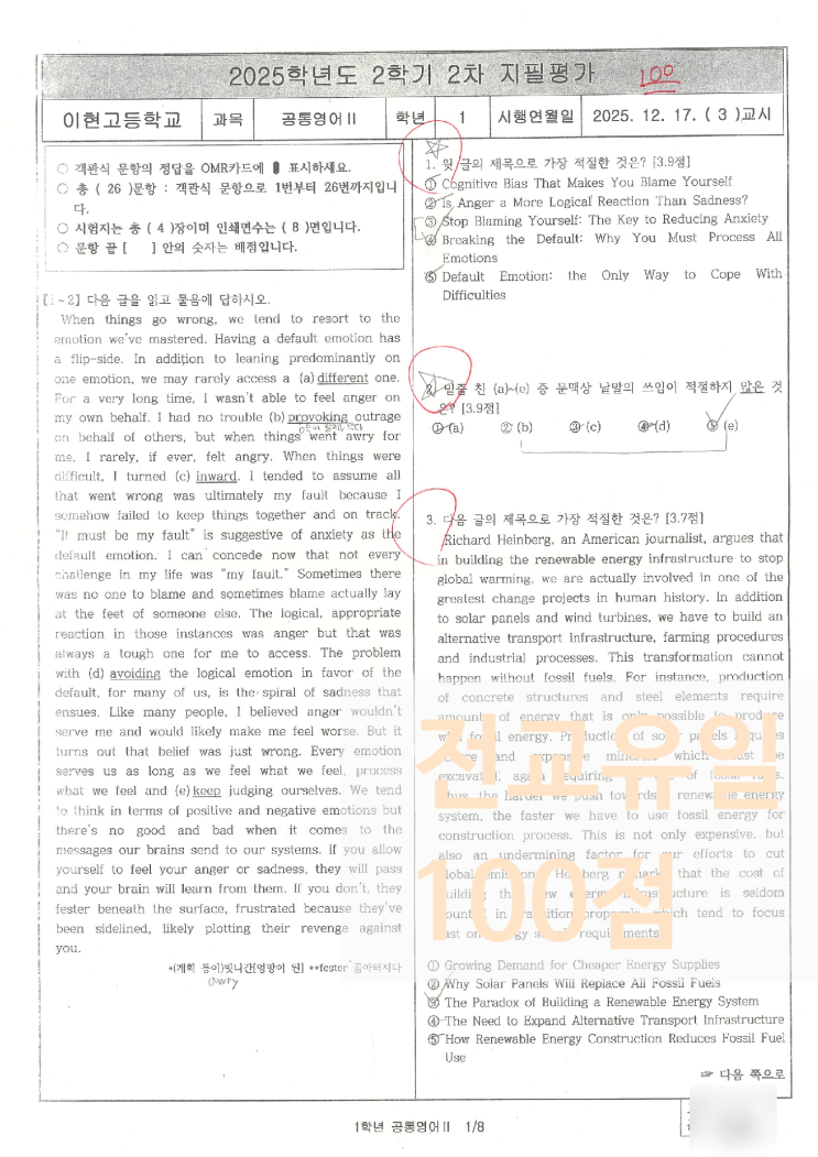 [이현고 1학년 영어 기말고사] 전교 유일 100점!