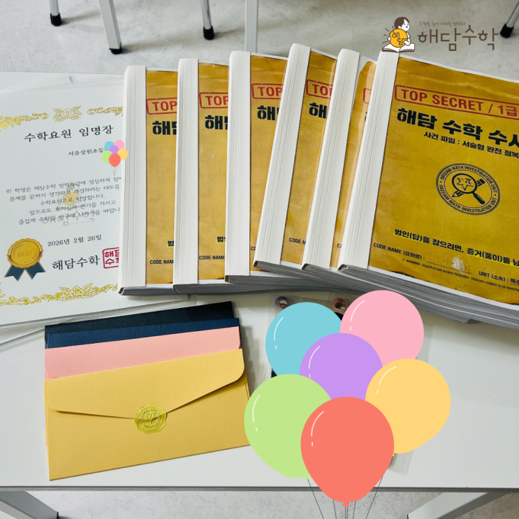안녕하세요. 아이들의 생각하는 힘을 키워주는 해담수학입니다. 이번 겨울, 해담수학 강의실은 그 어느 때보다 뜨거운 열기로 가득했습니다. 바로 〈해담 수학 수사대 : 서술형 완전 정복〉 임무를 수행한 우리 해담이들 덕분입니다. 드디어 겨울방학 특강의 마지막 날. 아이들은 평가 문제를 해결해 보고, 방학 동안 공부한 내용을 한 권의 책으로 정리하여 직접 제본해 보았습니다. 한 장 한 장 차곡차곡 쌓아 온 결과물이 책의 형태로 완성되는 과정을 보며, 아이들 스스로도 무척 뿌듯해하는 모습이 인상적이었습니다. 방학 동안의 기록을 한 권으로 완성하는 시간 이번 마지막 시간에는 단순히 문제를 풀고 마무리하는 데서 그치지 않고, 아....... <img src="https://blogthumb.pstatic.net/MjAyNjAyMjhfNTgg/MDAxNzcyMjg4NTI1MDY2.XPURkBUYyIBWnTmg618c8PHMZYeO5la_A5RvIFf_uOcg.0VkGH9kC-mEQaO57X10iBqa-KvzU8VvDp2vRRPtP4Z4g.PNG/1.png?type=s3" />