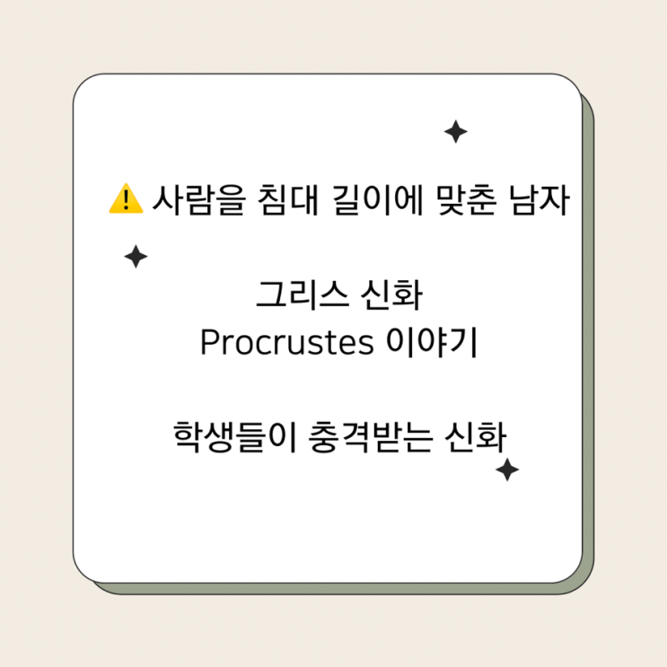 그리스 신화에는 인간의 사고방식을 경고하는 상징적인 이야기가 많습니다. 그중 하나가 바로 프로크루스테스(Procrustes)의 침대 이야기입니다. 자신의 기준에 맞지 않으면 억지로 맞추려는 위험한 사고방식을 보여주는 이 신화는 오늘날 교육과 사회에서도 중요한 메시지를 전합니다. 프로크루스테스(Procrustes)의 침대 Q&A Q1. Procrustean bed 뜻은 무엇인가요? A. 자신의 기준을 모든 사람에게 강제로 적용하려는 사고방식을 의미합니다. Q2. Procrustes는 누구인가요? A. 그리스 신화에 등장하는 인물로, 여행자들을 자신의 침대 길이에 맞추려 했던 잔혹한 인물입니다. Q3. 왜 이 이야기가 유명해졌나요? A. 인간이 자신의 기준을 절....... <img src="https://blogthumb.pstatic.net/MjAyNjAzMThfMTEy/MDAxNzczNzk2ODc5ODUx.ZmGhhdmdfT2tm1woIrTa4SvKza7lsN9nYH4fZFteqwMg.L7tkHBko7jGejP0eFLKeLs-YDxfIDY2ZHEILDpuAkKwg.PNG/%BA%A3%C0%CC%C1%F6_%B1%F2%B2%FB%C7%D1_%BA%ED%B7%CE%B1%D7_%C4%AB%B5%E5%B4%BA%BD%BA_%BD%E6%B3%D7%C0%CF_%C0%CE%BD%BA%C5%B8%B1%D7%B7%A5_%C6%F7%BD%BA%C6%AE.png?type=s3" />