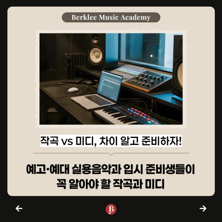 Play Your Dream, Sing Your Future! 안녕하세요. 마곡에 위치한 버클리실용음악학원입니다. 실용음악과 입시 준비생들이 가장 많이 묻는 질문, 작곡과 미디의 차이 실용음악과 진학을 고민하는 학생들이 상담을 하면서 가장 많이 묻는 질문이 있습니다. “미디랑 작곡이 다른 건가요?” “작곡 전공하려면 미디를 꼭 해야 하나요?” 두 분야는 비슷해 보이지만 실제로는 접근 방식과 배우는 내용이 꽤 다릅니다. 오늘은 실용음악 입시를 준비하는 학생들이 가장 헷갈려하는 작곡과 미디의 차이를 정확하게 정리해보겠습니다. 작곡이란? 작곡은 말 그대로 음악을 만들어내는 능력에 초점이 맞춰져 있습니다. ✅ 멜로디 만들기 ✅ 코드 진행....... <img src="https://blogthumb.pstatic.net/MjAyNjAzMDlfMjc5/MDAxNzczMDI5MzY4NTYw.Uf0DOq0Rq6DYrSyDngrPoACf9ypMF1XtJJ_B8cXc1C0g.PVoLgMlO6MxCTjXiKE1f9WftXi4IFXIhEjn5MW0oJfog.PNG/%B8%B6%B0%EE_%B9%F6%C5%AC%B8%AE_%BD%C7%BF%EB%C0%BD%BE%C7%C7%D0%BF%F8-001.png?type=s3" />
