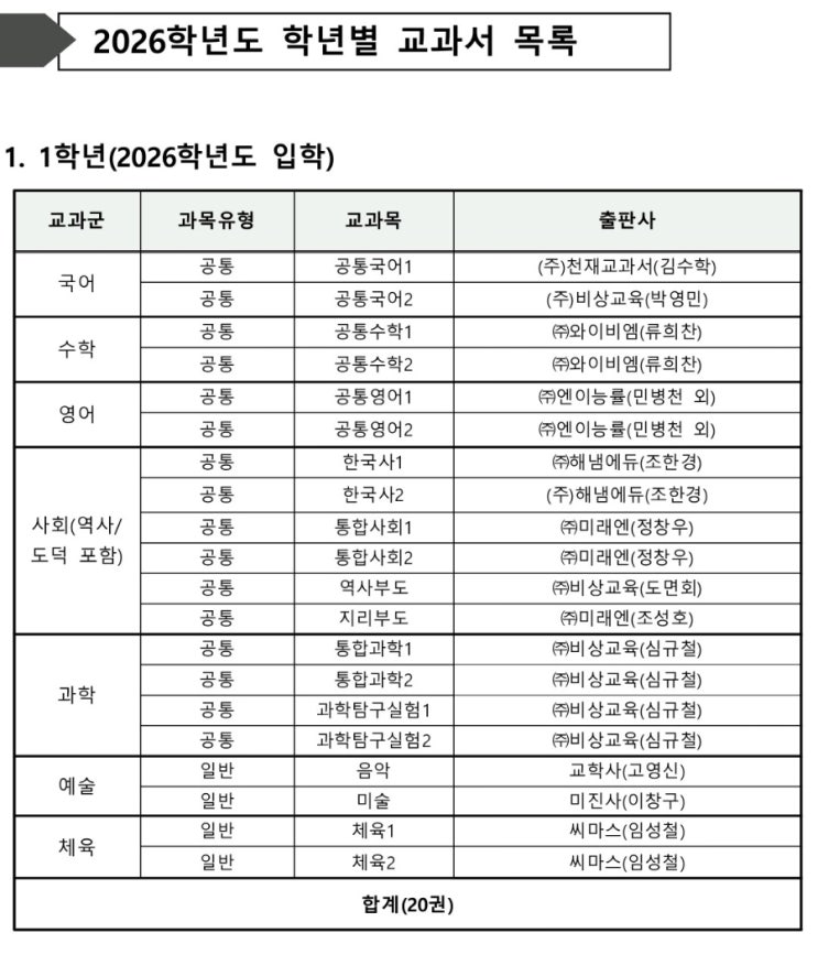 [여의도고] 2026년 1학년 교과서 목록